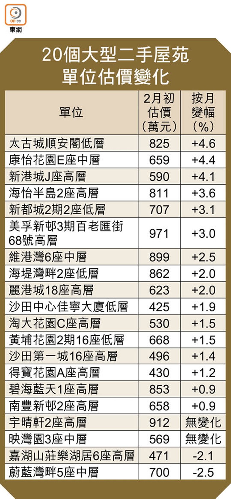其餘估價上升的屋苑,增幅相對溫和,包括奧運站維港灣、茶果嶺麗港城、沙田中心、紅磡黃埔花園、沙田第一城、鰂魚涌南豐新邨等,按月漲幅約0.9至2.5%不等。